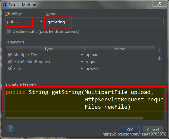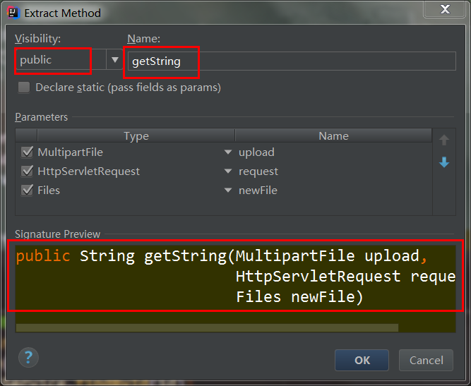 选中代码段->右键Refactor->Extract->Method.. (顺便查看快捷键 Alt+Shift+M) ->选择方法类型、方法名等(下方有预览)