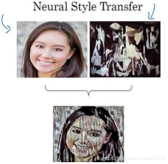 还有一个更有趣的例子,就是神经网络实现的图片风格迁移,比如说你有一张图片,但你想将这张图片转换为另外一种风格。所以图片风格迁移,就是你有一张满意的图片和一张 风格图片,实际上右边这幅画是毕加索的画作,而你可以利用神经网络将它们融合到一起, 描绘出一张新的图片。它的整体轮廓来自于左边,却是右边的风格,最后生成下面这张图片。 这种神奇的算法创造出了新的艺术风格,所以在这门课程中,你也能通过学习做到这样的事情。