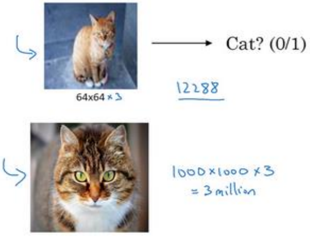 如果你要操作更大的图片,比如一张 1000×1000 的图片,它足有 1 兆那么大,但是特征向量的维度达到了 1000×1000×3 ,因为有 3 个 RGB 通道,所以数字将会是 300 万。如果你在尺寸很小的屏幕上观察,可能察觉不出上面的图片只有 64×64 那么大,而下面一张是 1000×1000 的大图。