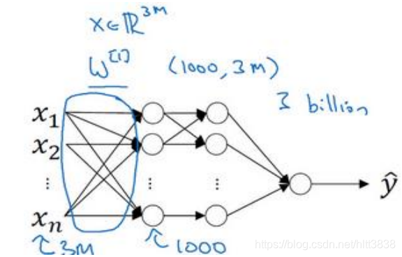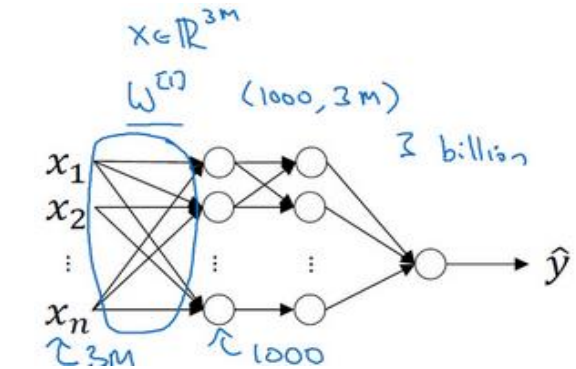 如果你要输入 300 万的数据量,这就意味着,特征向量 ? 的维度高达 300 万。所以在第 一隐藏层中,你也许会有 1000 个隐藏单元,而所有的权值组成了矩阵 ? [1] 。如果你使用了 标准的全连接网络,就像我们在第一门和第二门的课程里说的,这个矩阵的大小将会是 1000×300 万。因为现在 ? 的维度为 3? , 3? 通常用来表示 300 万。这意味着矩阵 ? [1] 会有 30 亿个参数,这是个非常巨大的数字。在参数如此大量的情况下,难以获得足够的数据来防止 神经网络发生过拟合和竞争需求,要处理包含 30 亿参数的神经网络,巨大的内存需求让人 不太能接受。