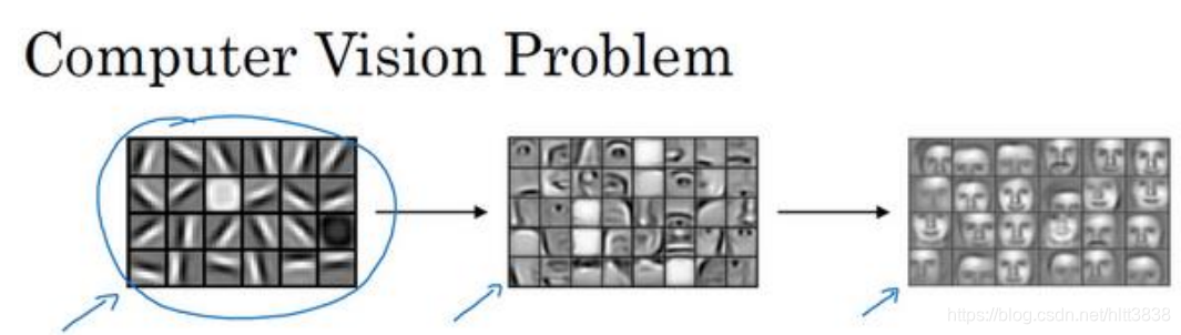 我说过神经网络的前几层是如何检测边缘的,然后,后面的层有可能 检测到物体的部分区域,更靠后的一些层可能检测到完整的物体,这个例子中就是人脸。