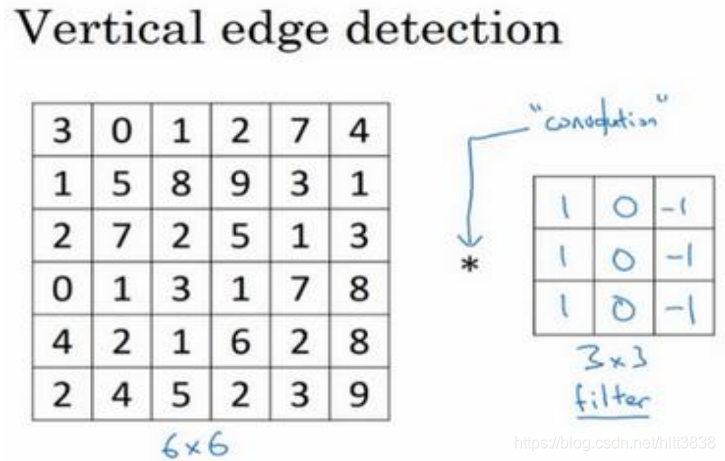 在论文它有时候会被称为核,而不是过滤器,但在这个视频中,我将使用过滤器这个术语。对这个 6×6 的图像进行卷积运算,卷积运算用 “∗” 来表示,用 3×3 的过滤器对其进行卷积.