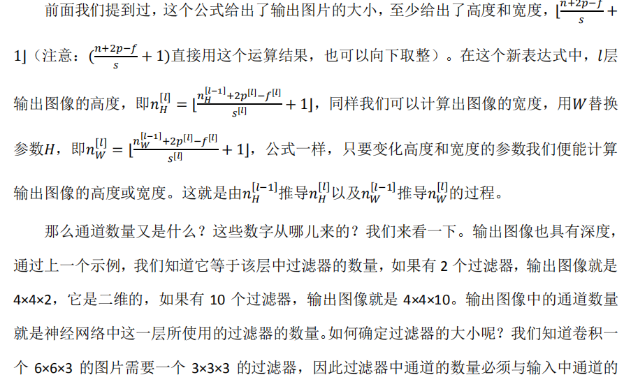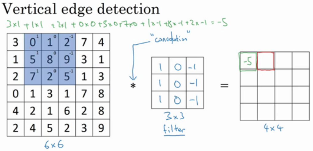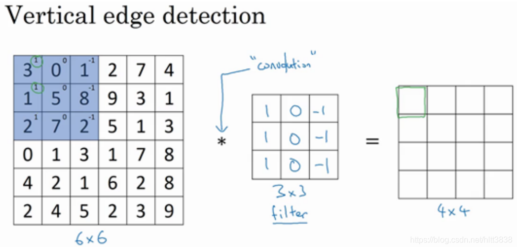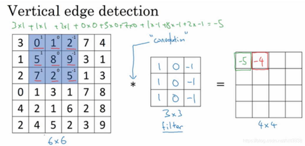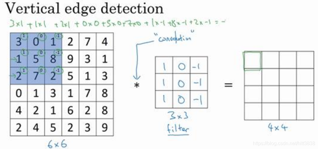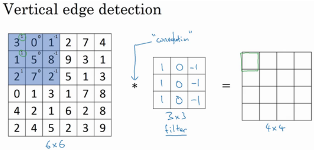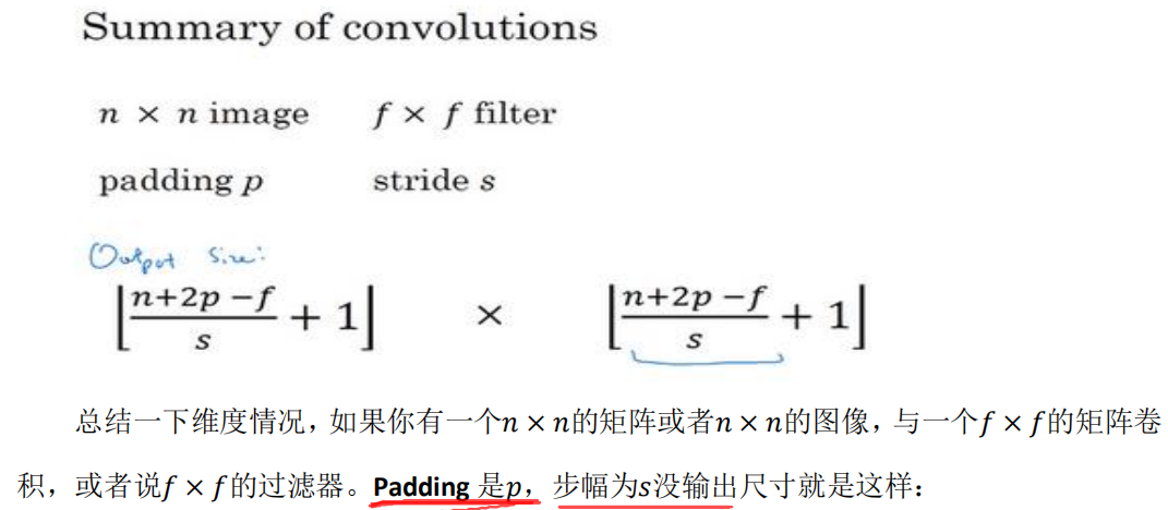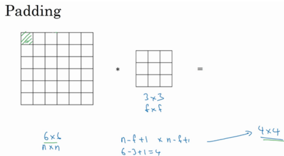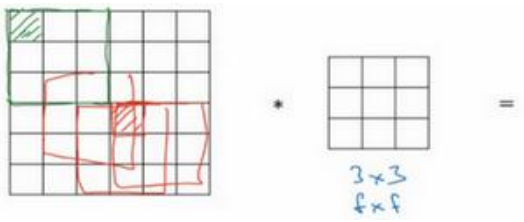 如果你用一个3×3的过滤器卷积一个6×6的图像,你最后会得到一个 4×4的输出,也就是一个4×4 矩阵。那是因为你的 3×3 过滤器在 6×6 矩阵中,只可能有 4×4 种可能的位置。这背后的数学解释是,如果我们有一个 ? × ?的图像,用? × ?的过滤器做卷积,那么输出的维度就是(? − ? + 1) × (? − ? + 1) 。在这个例子里是 6 − 3 + 1 = 4 , 因此得到了一个 4×4 的输出。