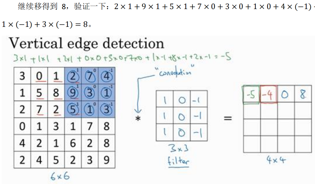 继续做同样的元素乘法,然后加起来,所以是 0 × 1 + 5 × 1 + 7 × 1 + 1 × 0 + 8 × 0 + 2 × 0 + 2 × (−1) + 9 × (−1) + 5 × (−1)=-4