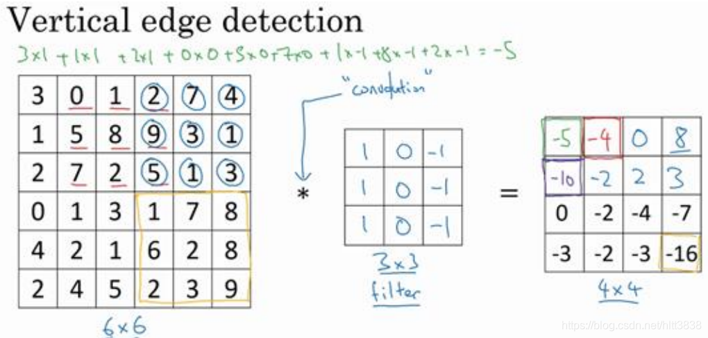为了说得更清楚一点,这个 -16 是通过底部右下角的 3×3 区域得到的。 因此 6×6 矩阵和 3×3 矩阵进行卷积运算得到 4×4 矩阵。这些图片和过滤器是不同维度的矩阵,但左边矩阵容易被理解为一张图片,中间的这个被理解为过滤器,右边的图片我们