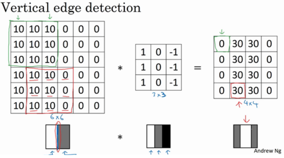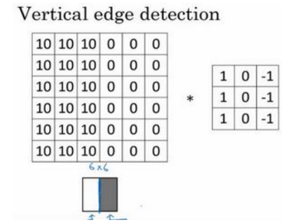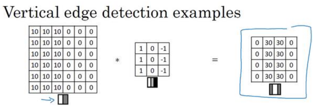 如果把最右边的矩阵当成图像,它是这个样子。在中间有段亮一点的区域,对应检查到这个 6×6 图像中间的垂直边缘。这里的维数似乎有点不正确,检测到的边缘太粗了。因为在这个例子中,图片太小了。如果你用一个 1000×1000 的图像,而不是6×6 的图片,你会发现其会很好地检测出图像中的垂直边缘。在这个例子中,在输出图像中间的亮处,表示在图像 中间有一个特别明显的垂直边缘。从垂直边缘检测中可以得到的启发是,因为我们使用 3×3 的矩阵(过滤器),所以垂直边缘是一个 3×3 的区域,左边是明亮的像素,中间的并不需要 考虑,右边是深色像素。在这个 6×6 图像的中间部分,明亮的像素在左边,深色的像素在右 边,就被视为一个垂直边缘,卷积运算提供了一个方便的方法来发现图像中的垂直边缘。 所以你已经了解卷积是怎么工作的,在下一个视频中,你将会看到如何使用卷积运算作为卷积神经网络的基本模块的。