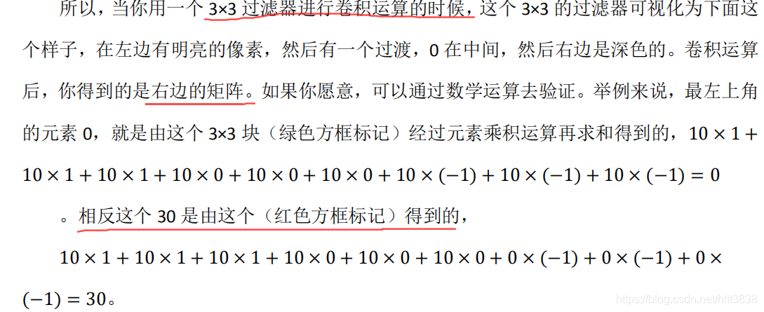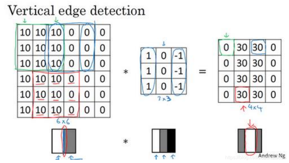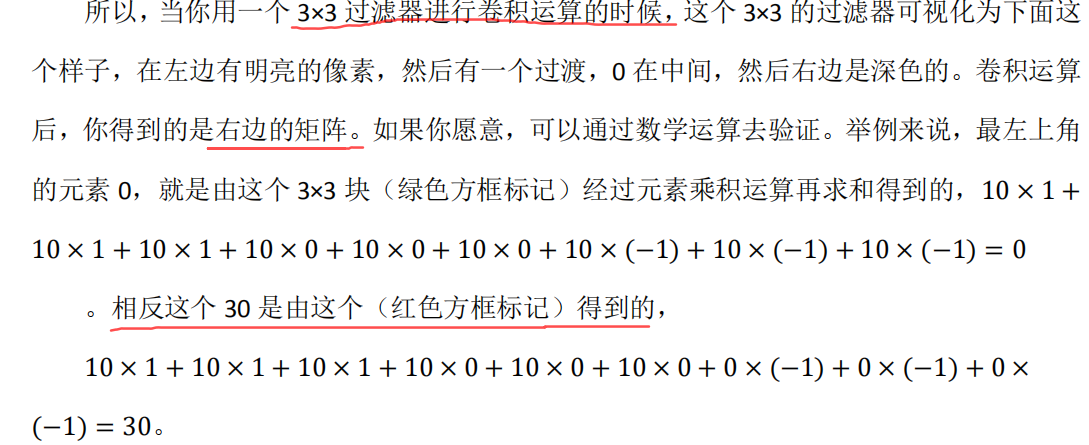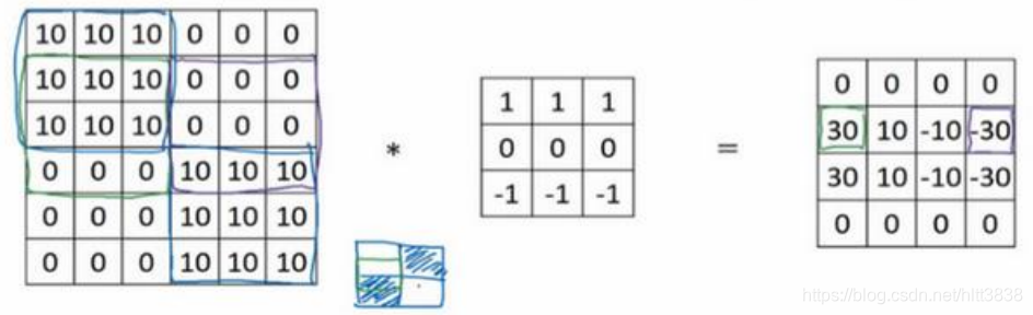 再举个例子,这里的 30 (右边矩阵中绿色方框标记元素)代表了左边这块 3×3 的区域 (左边矩阵 绿色 方框标记部分),这块区域确实是上边比较亮,而下边比较暗的,所以它在这里发现了一条正边缘。而这里的-30 ( 右边矩阵中紫色方框标记元素 )又代表了左边另一块区域(左边矩阵紫色方框标记部分),这块区域确实是底部比较亮,而上边则比较暗,所以在这里它是一条负边。
