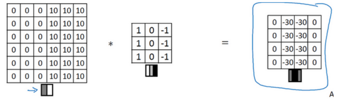 现在这幅图有什么变化呢?它的颜色被翻转了,变成了左边比较暗,而右边比较亮。现在亮度为 10 的点跑到了右边,为 0 的点则跑到了左边。如果你用它与相同的过滤器进行卷积,最后得到的图中间会是-30 ,而不是30 。如果你将矩阵转换为图片,就会是该矩阵下面 图片的样子。现在中间的过渡部分被翻转了,之前的 30 翻转成了 -30 ,表明是由暗向亮过渡, 而不是由亮向暗过渡。