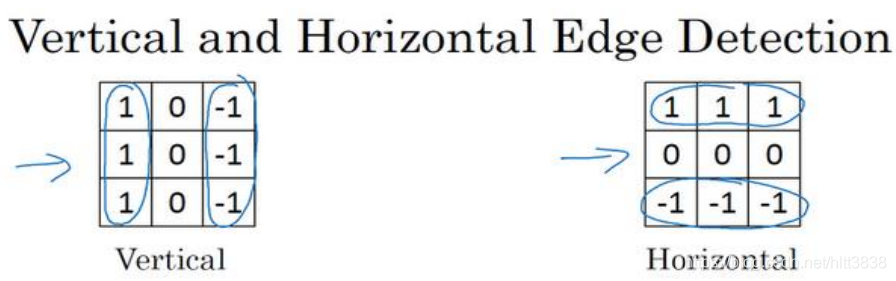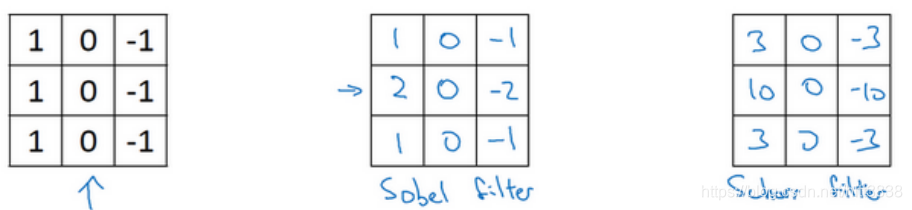 再来看看更多的边缘检测的例子,我们已经见过这个 3×3 的过滤器,它可以检测出垂直的边缘。所以,看到右边这个过滤器,我想你应该猜出来了,它能让你检测出水平的边缘。 提醒一下,一个垂直边缘过滤器是一个 3×3 的区域,它的左边相对较亮,而右边相对较暗。 相似的,右边这个水平边缘过滤器也是一个 3×3 的区域,它的上边相对较亮,而下方相对较暗。