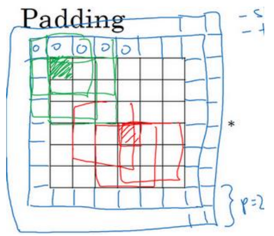 刚才我已经展示过用一个像素点来填充边缘,如果你想的话,也可以填充两个像素点, 也就是说在这里填充一层。实际上你还可以填充更多像素。我这里画的这种情况,填充后? = 2.