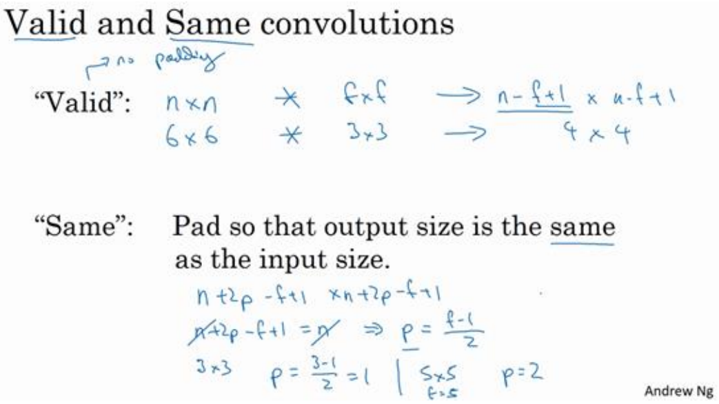 至于选择填充多少像素,通常有两个选择 ,分别叫做 Valid 卷积和 Same 卷积。 Valid 卷积意味着不填充,这样的话,如果你有一个 ? × ? 的图像,用一个 ? × ? 的过滤器 卷积,它将会给你一个(? − ? + 1) × (? − ? + 1) 维的输出。这类似于我们在前面的视频中展 示的例子,有一个 6×6 的图像,通过一个 3×3 的过滤器,得到一个 4×4 的输出。
