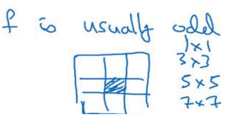 第二个原因 是当你有一个奇数维过滤器,比如 3×3 或者 5×5 的,它就有一个中心点。有时在计算机视觉里,如果有一个中心像素点会更方便,便于指出过滤器的位置。 也许这些都不是为什么? 通常是奇数的充分原因,但如果你看了卷积的文献,你经常会