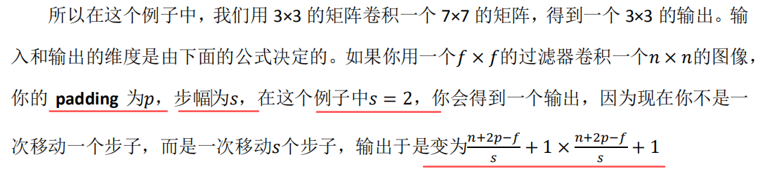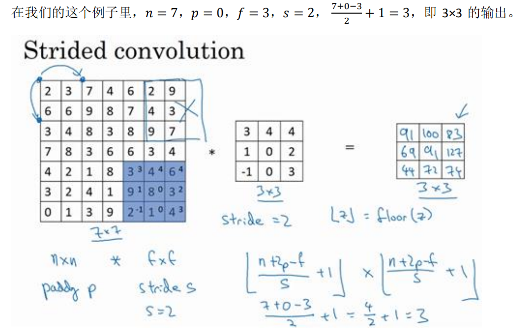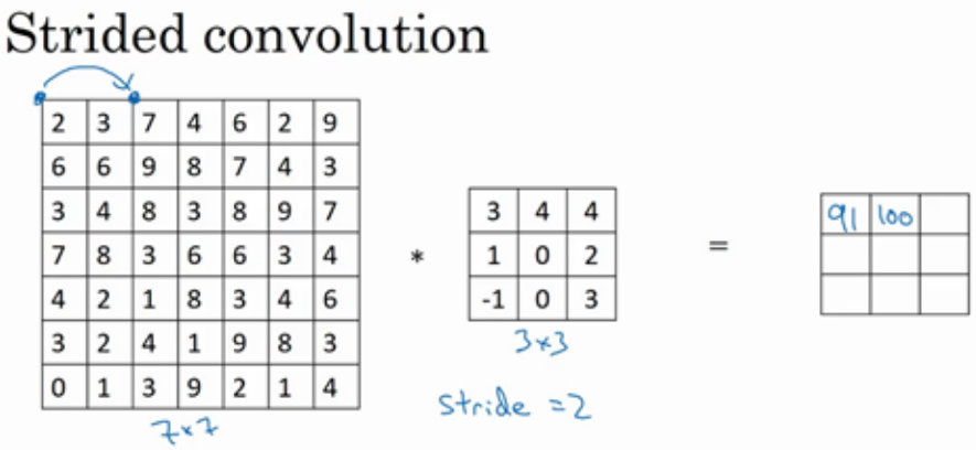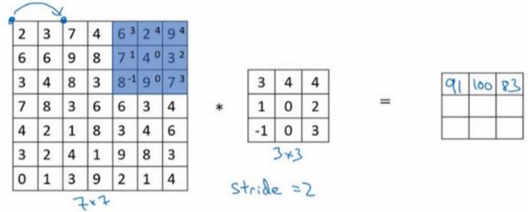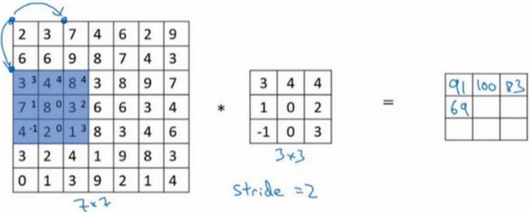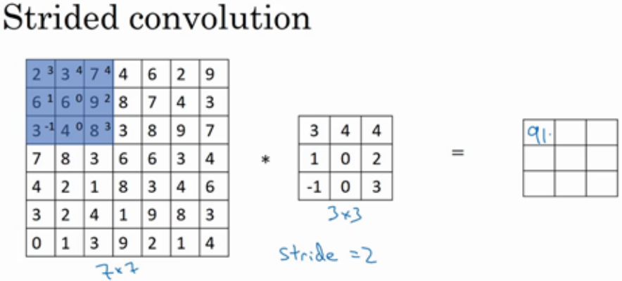 如果你想用 3×3 的过滤器卷积这个 7×7 的图像,和之前不同的是, 我们把步幅设置成了 2 。你还和之前一样取左上方的 3×3 区域的元素的乘积,再加起来,最后结果为 91 。