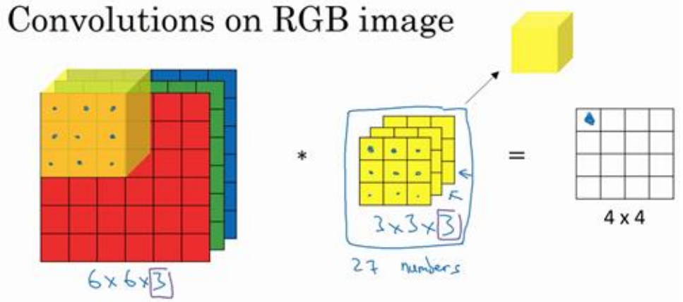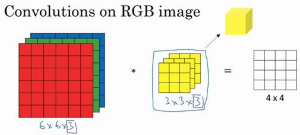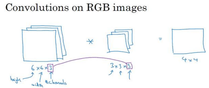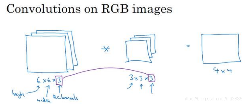 给这些起个名字(原图像),这里的第一个 6 代表图像高度,第二个 6 代表宽度,这个 3 代表通道的数目。同样你的过滤器也有高,宽和通道数,并且图像的通道数必须和过滤器 的通道数匹配,所以这两个数(紫色方框标记的两个数)必须相等。下个幻灯片里,我们就 会知道这个卷积操作是如何进行的了,这个的输出会是一个 4×4 的图像,注意是 4×4×1 ,最 后一个数不是 3 了。