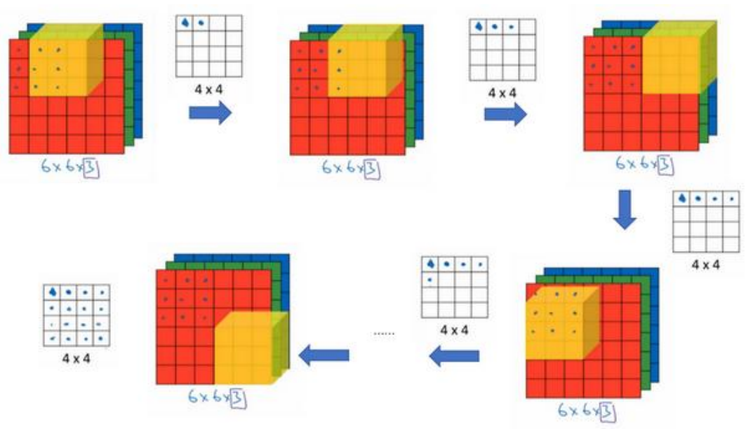 如果要计算下一个输出,你把这个立方体滑动一个单位,再与这 27 个数相乘,把它们都加起来,就得到了下一个输出,以此类推。