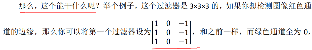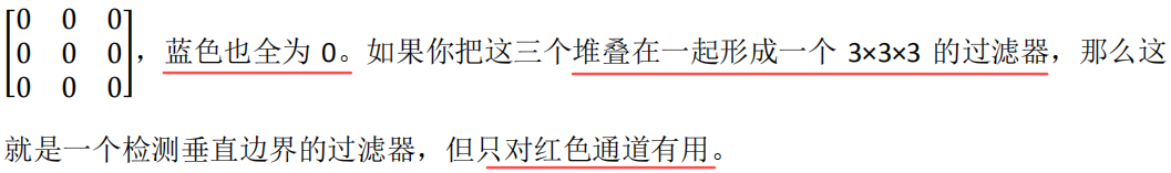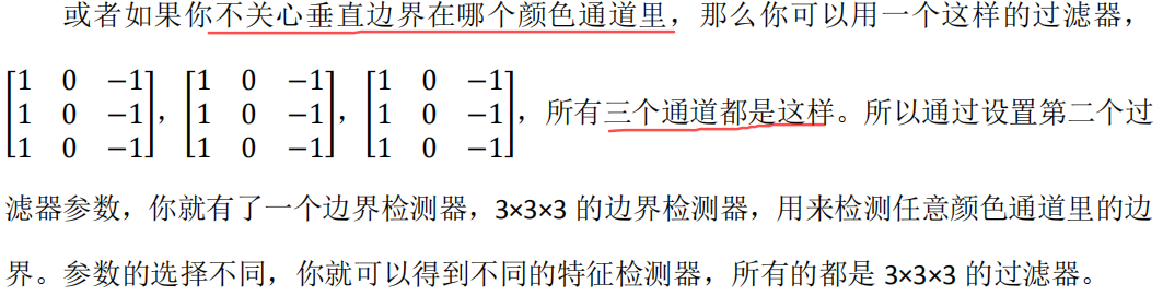 使得反向传播算法能够让神经网络学习任何它所需要的 3×3 的过滤器,并在整幅图片上去 应用它。这里,这里,还有这里(左边矩阵蓝色方框标记部分),去输出这些,任何它所检测到的特征,不管是垂直的边缘,水平的边缘,还有其他奇怪角度的边缘,甚至是其它的连名字都没有的过滤器。