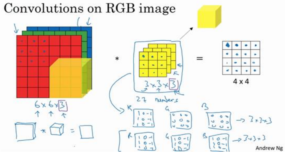 为了计算这个卷积操作的输出,你要做的就是把这个 3×3×3 的过滤器先放到最左上角的位置,这个 3×3×3 的过滤器有 27 个数, 27 个参数就是 3 的立方。依次取这 27 个数,然后乘以相应的红绿蓝通道中的数字。先取红色通道的前 9 个数字,然后是绿色通道,然后再是蓝色通道,乘以左边黄色立方体覆盖的对应的 27 个数,然后把这些数都加起来,就得到 了输出的第一个数字。