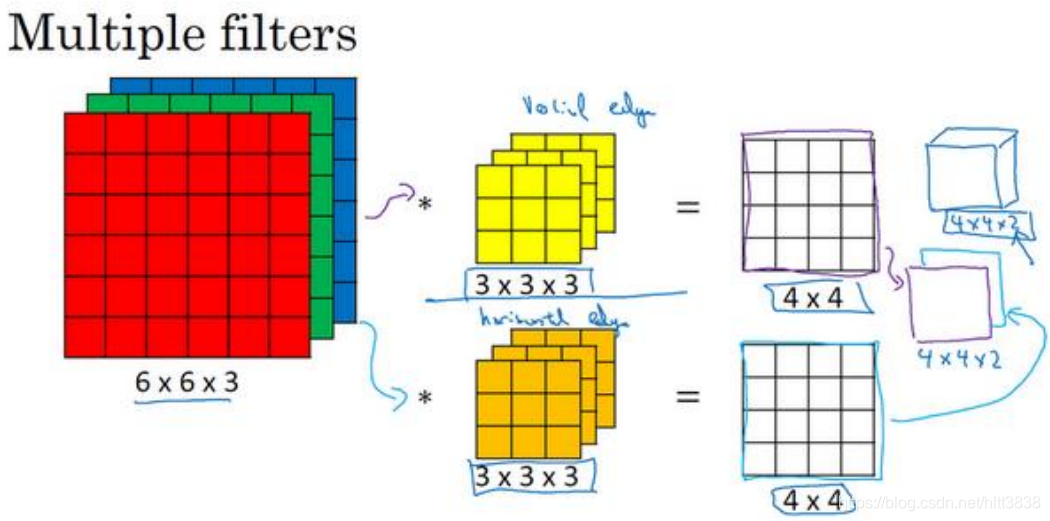再注意一下这个卷积立方体,一个 6×6×6 的输入图像卷积上一个 3×3×3 的过滤器,得到 一个 4×4 的二维输出。 现在你已经了解了如何对立方体卷积,还有最后一个概念,对建立卷积神经网络至关重 要。 就是,如果我们不仅仅想要检测垂直边缘怎么办?如果我们同时检测垂直边缘和水平边缘,还有 45°倾斜的边缘,还有 70°倾斜的边缘怎么做? 换句话说,如果你想同时用多个过