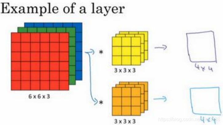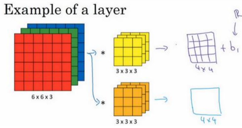 上节课,我们已经讲了如何通过两个过滤器卷积处理一个三维图像,并输出两个不同的 4×4 矩阵。假设使用第一个过滤器进行卷积,得到第一个 4×4 矩阵。使用第二个过滤器进行卷积得到另外一个 4×4 矩阵。