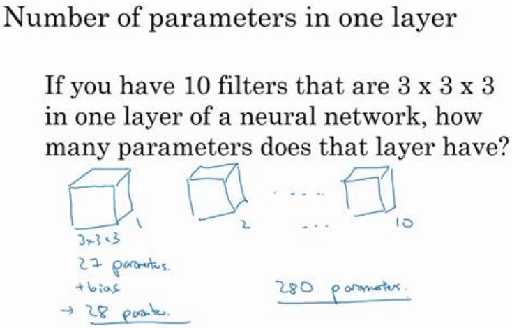 为了加深理解,我们来做一个练习。假设你有 10 个过滤器,而不是 2 个,神经网络的一层是 3×3×3 ,那么,这一层有多少个参数呢?我们来计算一下,每一层都是一个 3×3×3 的矩阵,因此每个过滤器有 27 个参数,也就是 27 个数。然后加上一个偏差,用参数 ? 表示, 现在参数增加到 28 个。上一页幻灯片里我画了 2 个过滤器,而现在我们有 10 个,加在一起