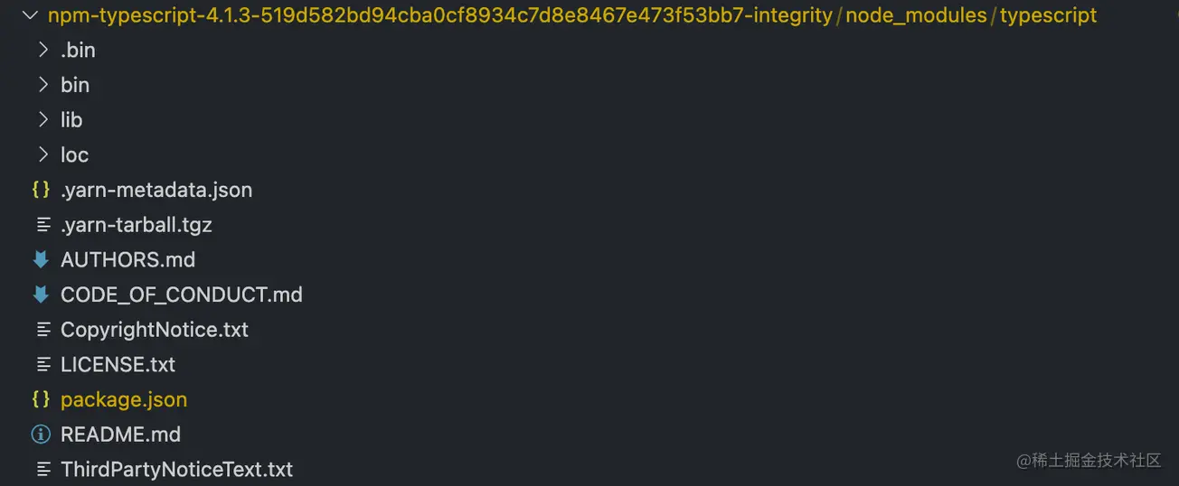 以 typescript 包为例简单分析缓存条目的内容,包括下载到的依赖压缩包(.yarn-tarball.tgz)、Metadata文件(.yarn-metadata.json)、压缩包解压文件。如果 package.json 中设置了bin字段,在 .bin 目录下拷贝相关文件。