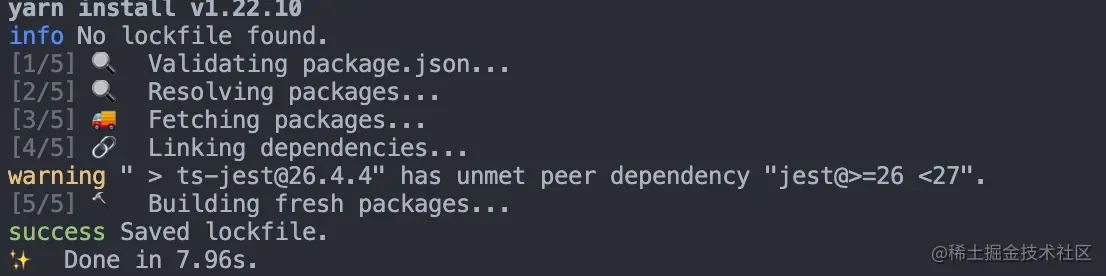 在进行 yarn install 的过程中,我们可以在终端看到由 emoji 图标装饰的5个步骤,如下图所示: