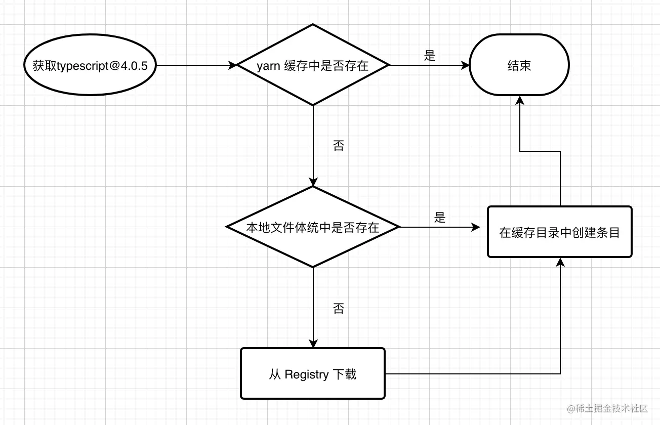 yarn 采取的策略是先确定缓存中是否存在,不存在的情况下再尝试以读取文件系统,从 Registry 下载的方式获取。