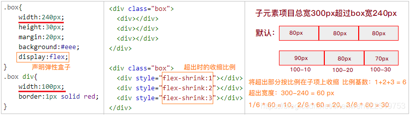 flex-shrink 属性指定了 flex 元素的收缩规则。当子项的默认宽度之和大于容器的时候会发生收缩,其收缩的大小是依据 flex-shrink 的值。