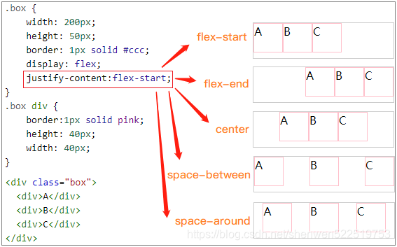 justify-content 用于设置弹性盒子元素在主轴(横轴)方向上的对齐方式。