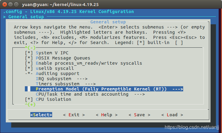 localmodconfig后会出来一系列内核配置选项的询问,原ubuntu平台配置过的自动按原配置,原平台配置不包括的配置选项会提示选择(选项出现<NEW>字样),如果不太明白选什么,其中会提示Preemption Mode 选项,选5 Fully ….,其余明白的自行选择,不明白的一路Enter,直至结束。