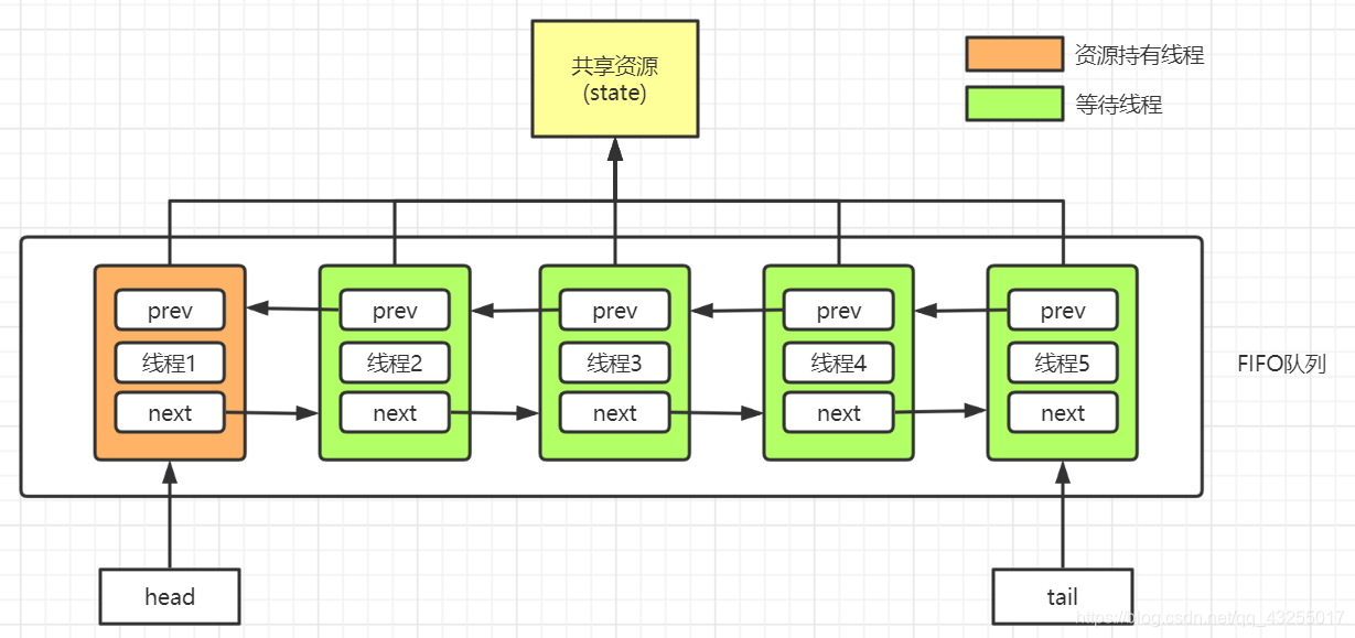 在FIFO队列中,头节点占有锁,也就是头节点才是锁的持有者,尾指针指向队列的最后一个等待线程节点,除了头节点和尾节点,节点之间都有前驱指针和后继指针