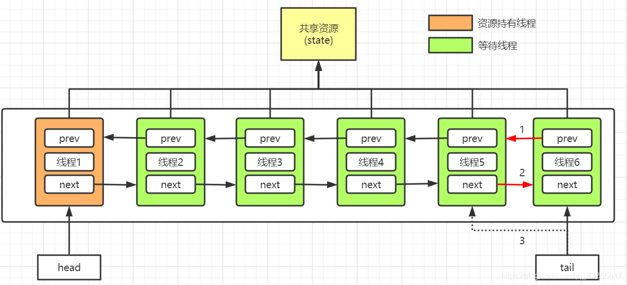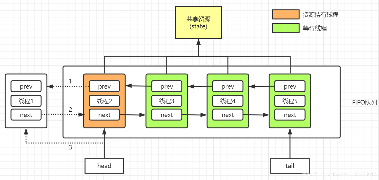 根据源码的分析和线程的竞争共享资源的原理,关于AQS的实现原理,我这里画了一张图: