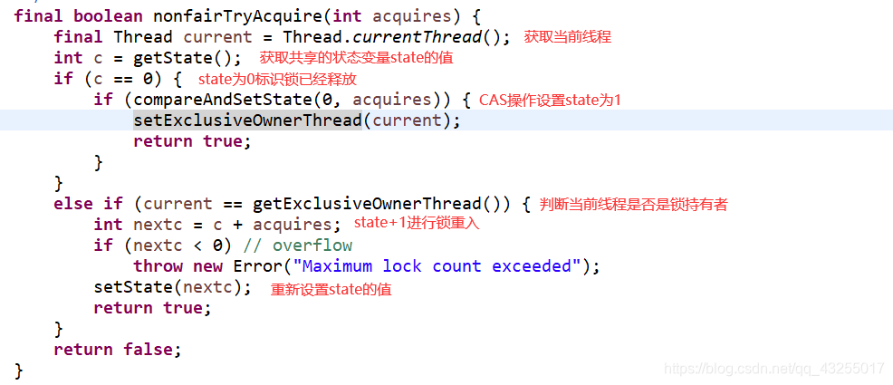 从源码的分析中可以看出,tryAcquire(arg)的实现也就是判断state的值是否已经被释放,若释放则当前线程就会CAS操作将state设置为1,若是没有释放,就会判断是否可以进行锁的重入。