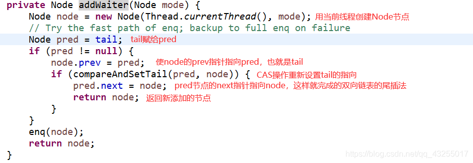 分析完tryAcquire(arg)的实现,来看看addWaiter,入队操作的实现源码如下:
