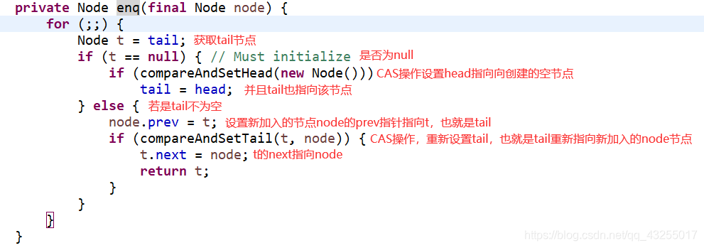 当然这里的前提是队列中不为空,若是为空的话,不会走上面的逻辑,而是走enq(node),进行初始化节点,我们来看看enq(node)操作,源码如下: