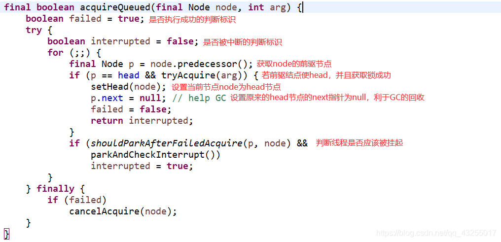 执行完上面的入对操作后,接着执行acquireQueued方法,来看看它的具体实现源码: