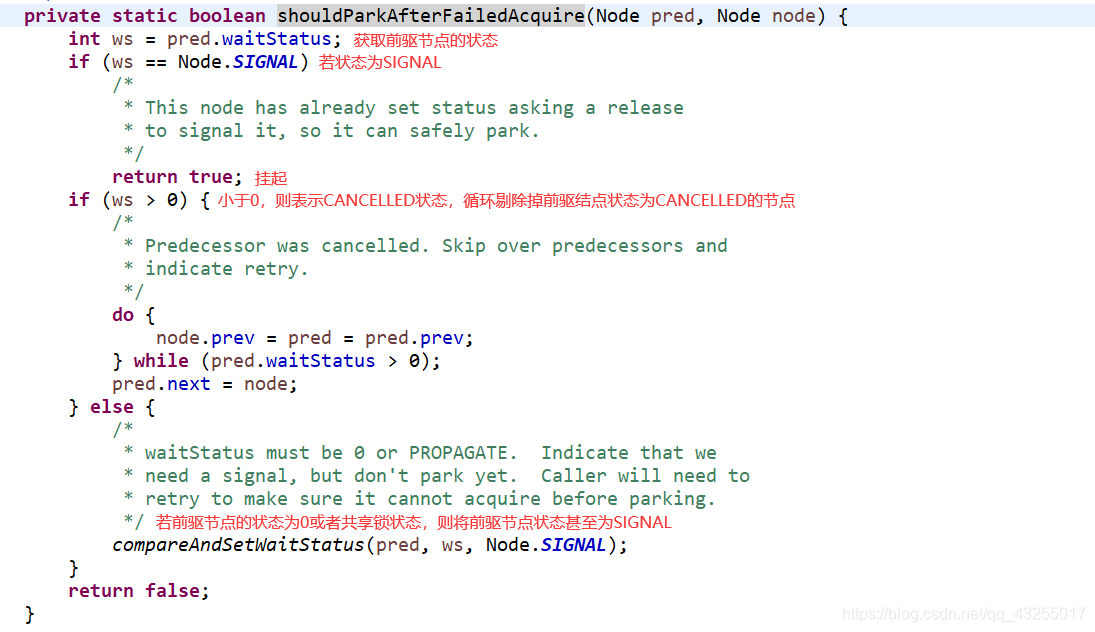 在shouldParkAfterFailedAcquire中的实现,当前驱节点的状态量waitStatus为SIGNAL的时候,就会挂起。