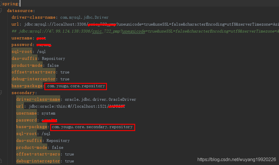 图中标注的Repository包路径就成了我们放置不同数据源的DAO工具位置。这样在不同的Repository路径下创建的接口就会指向不同的数据源,同时同一个数据源又归在同一个路径下,这种方式非常便于管理不同数据源的sql。