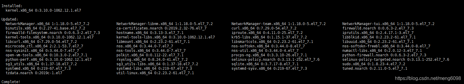 #sudo yum update时间有些长,耐心等待,中间有确认下载提示 输入Y,等到出现如下输出compele!则安装完成。