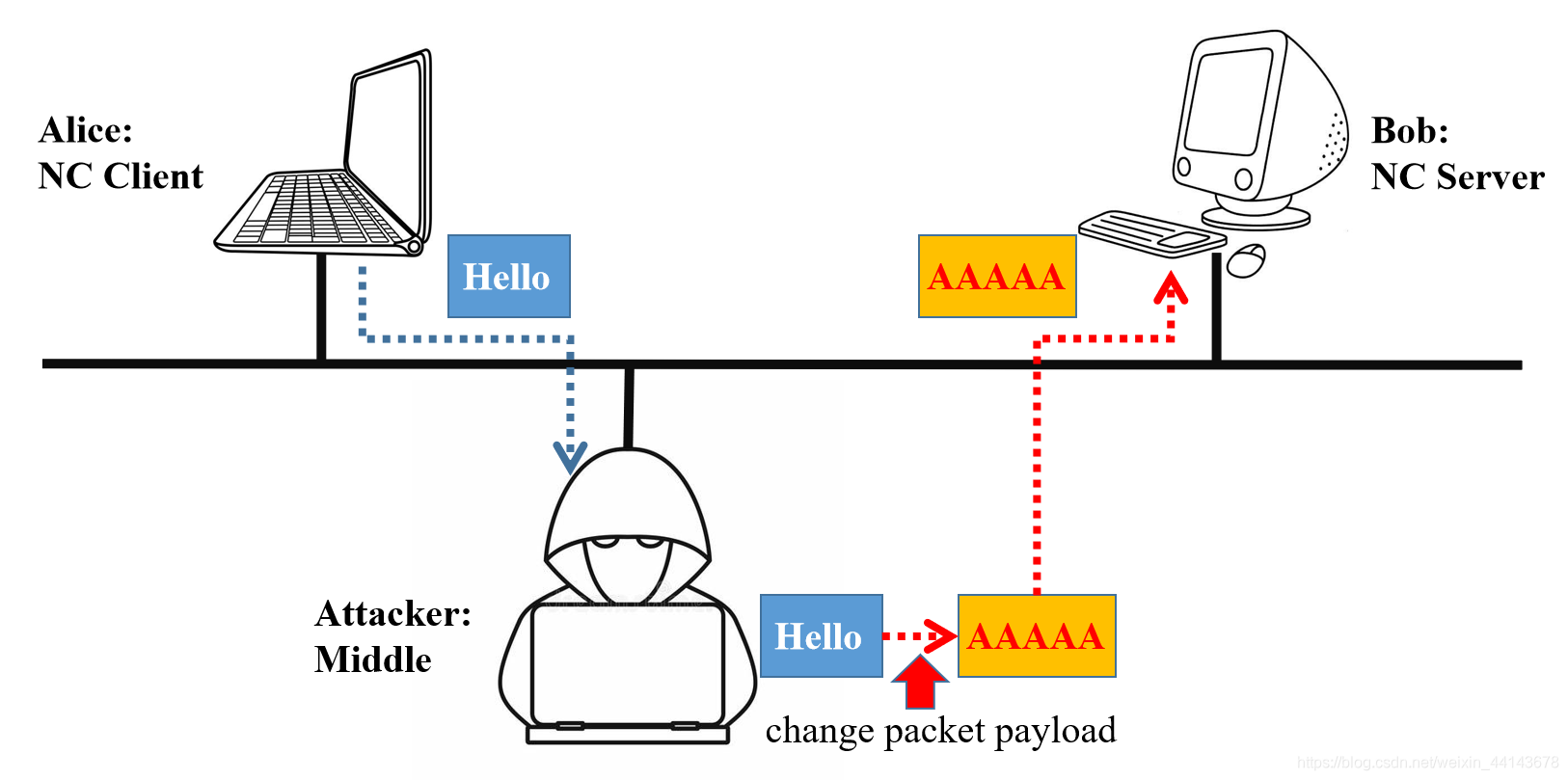 然后让Alice和Bob进行Netcat通信,我们发现此时Alice和Bob可以经过Attacker正常通信: