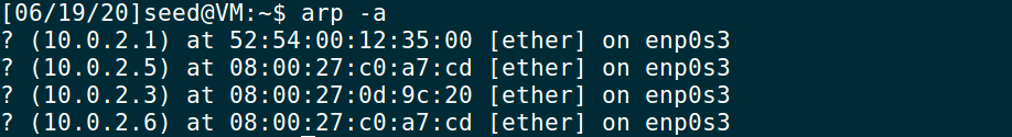 攻击效果:Bob的ARP缓存表中出现了Alice的IP地址并且映射到了Attacker的MAC地址。同时也添加了Attacker的映射记录。