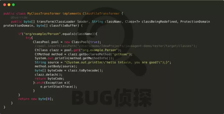 其中MyClassTransformer是我自定义的实现了ClassFileTransformer接口的类: