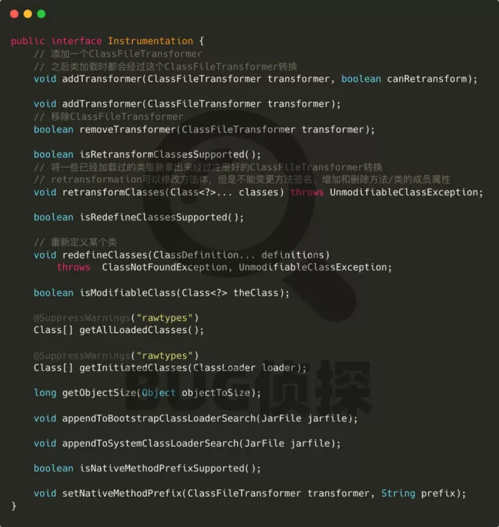 Instrumention支持的功能都在java.lang.instrument.Instrumentation接口中体现,而我们最关注的还是其中涉及到类转换相关的方法,比如addTransformer以及retransformClasses