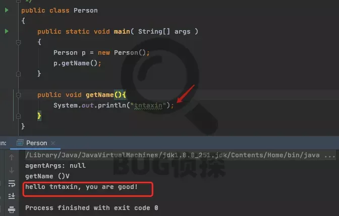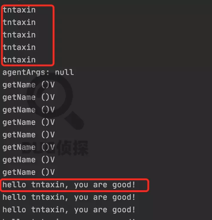可以看到,原本的getName方法会打印tntaxin,而经过agent处理过后的getName应该会打印hello tntaxin, you are good!
