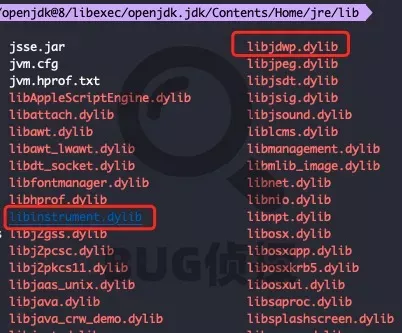 这个动态链接库可以在{JAVA_HOME}/jre/lib 下找到,除此之外,还能看到和调试相关的agent实现——libjdwp.dylib