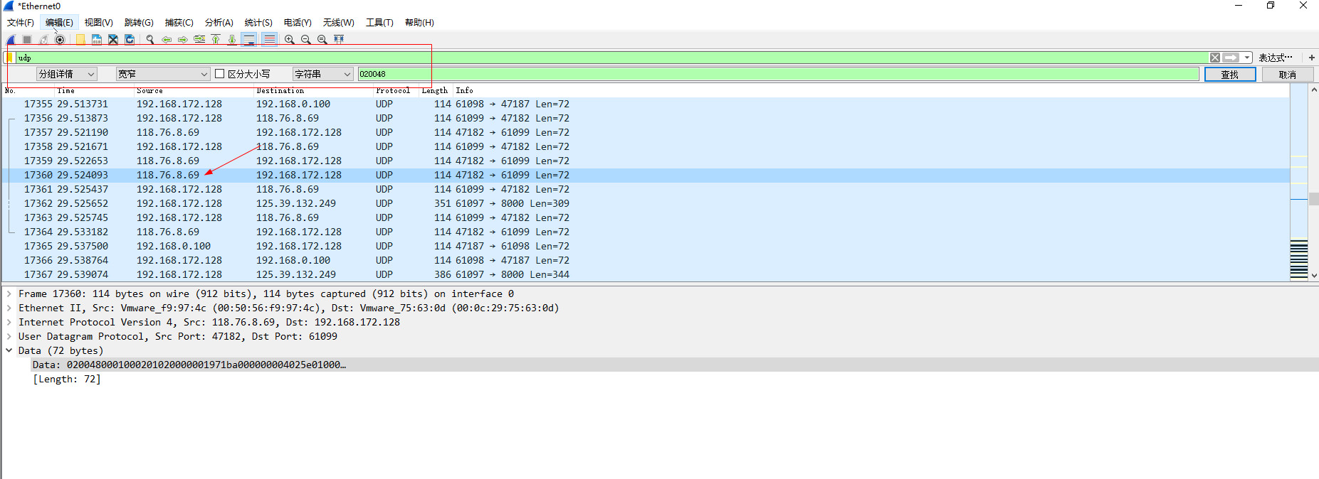 step3:在wireshark中,点---编辑----分组搜索,在表达式中,输入:udp,选择“分组详情”----“字符串”-----“020048”。即可查到好友IP。