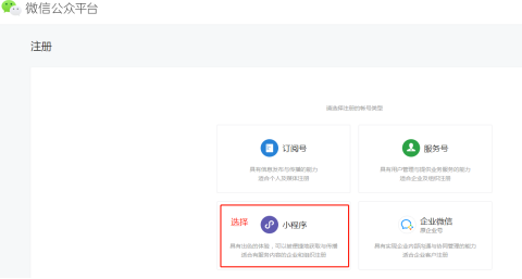 选择“小程序”,点击“查看类型区别”可查看不同类型帐号的区别和优势。