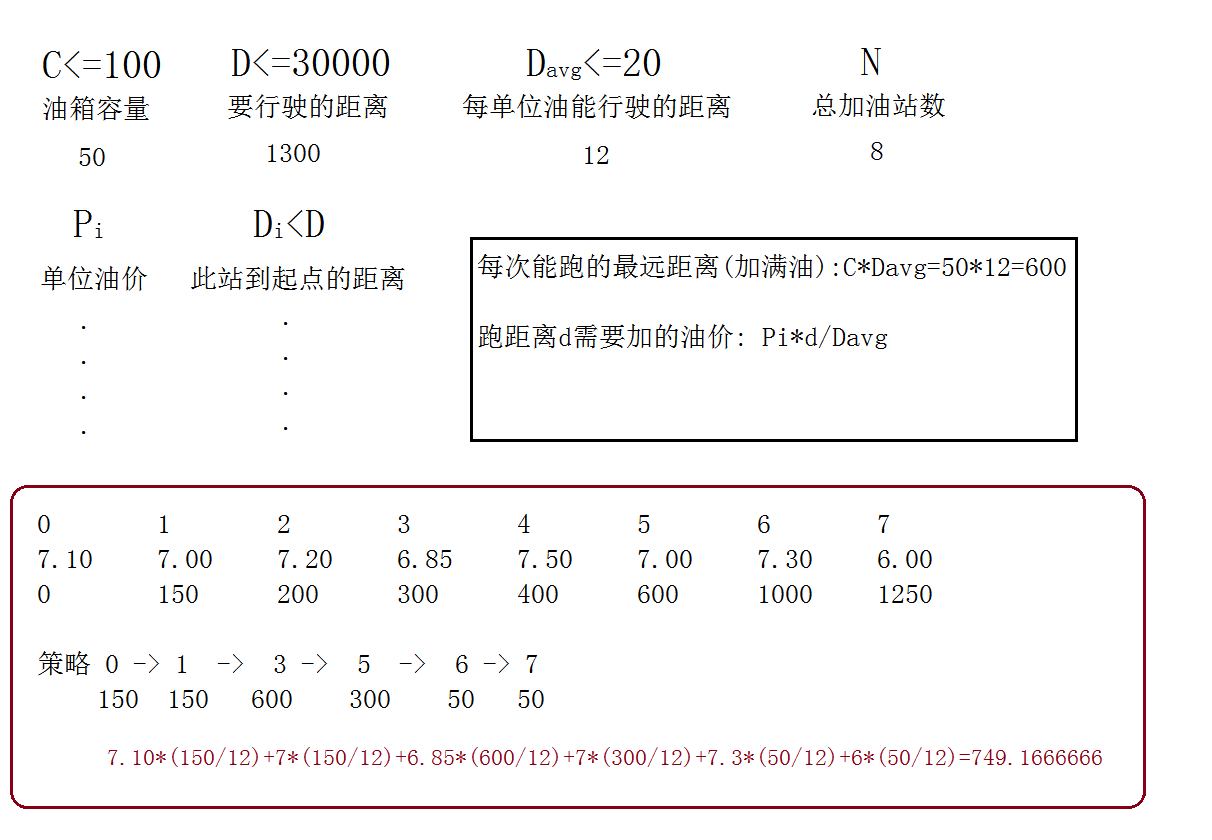 贪心要领: 要遵守的一般规则是,每次经过一个点时,油箱里烧的油一定是此点向前600m(加满油最大 距离)范围内最便宜的加油站里的油