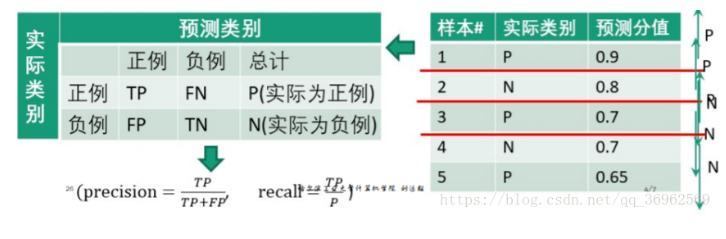 在阈值以下的部分,当作负例,则预测为负例的取值情况是正确预测值,即如果本身是正例,则取TP;如果本身是负例,则取TN,其都为预测分值。 负样本非常多,因此FPR=FP/N−FPR=FP/N−总是很小,考察TPR和FPR不是很有意义,这是候我们就只讨论正样本,考察TPR(recall)和PPV(pricision).,