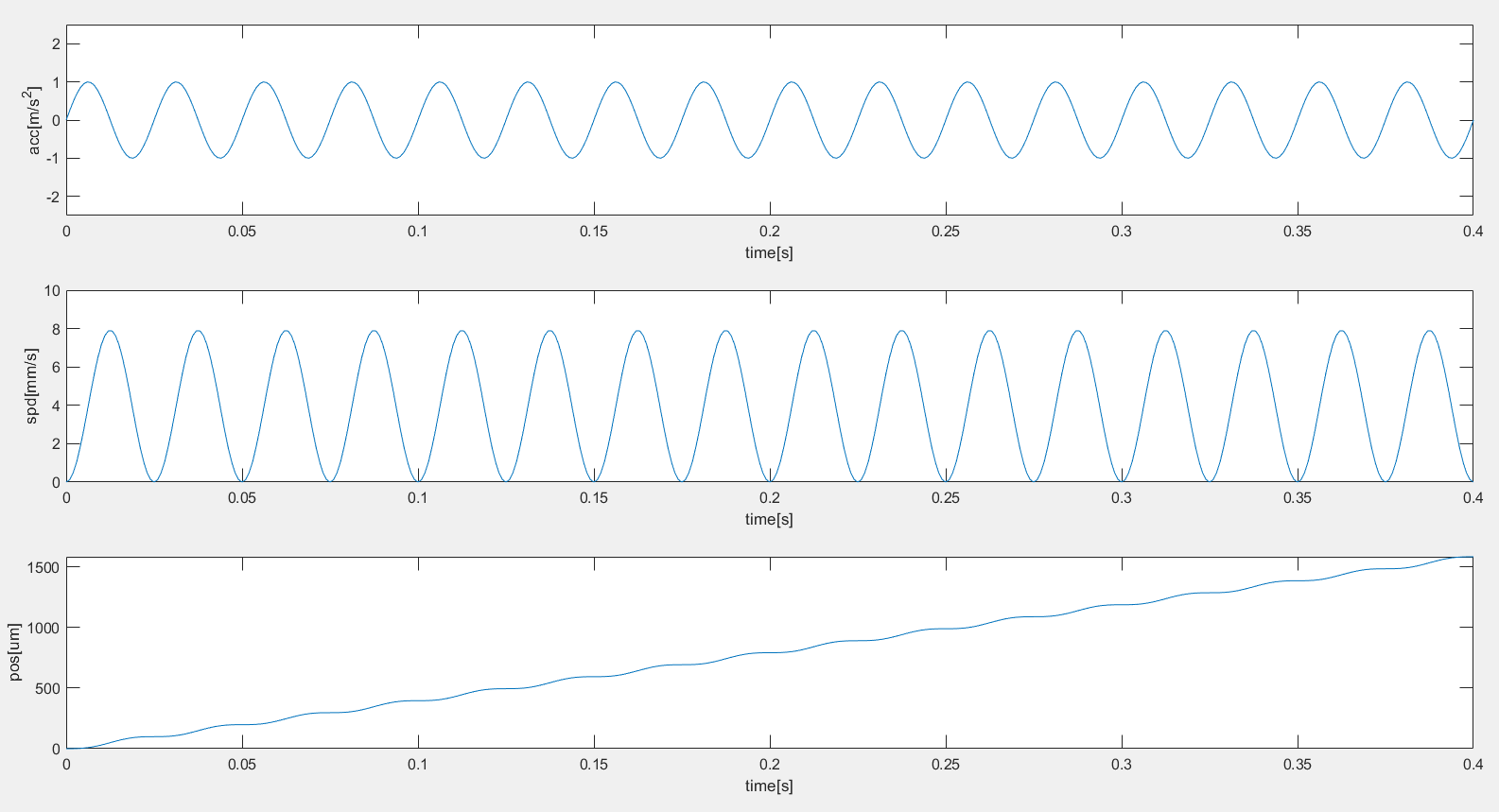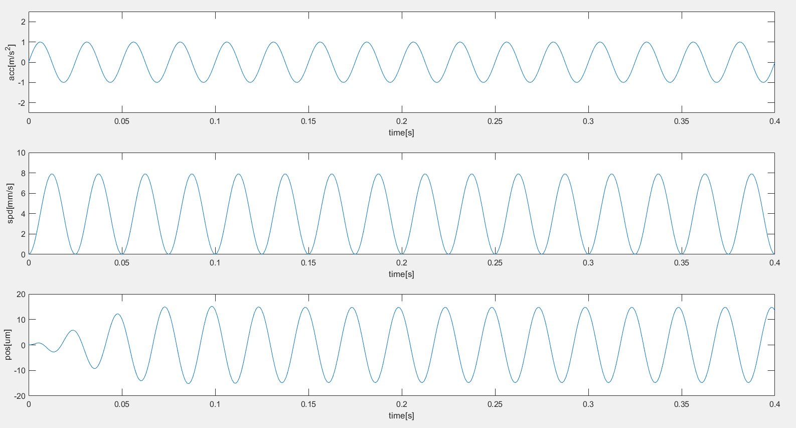 可以看到,前两个周期内的位移信号存在一定程度的信号失真。但是后面的积分后的位移信号是可以接受的结果。